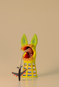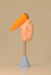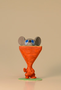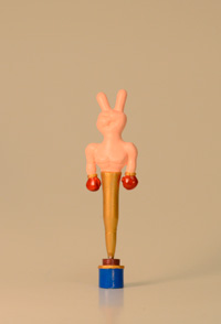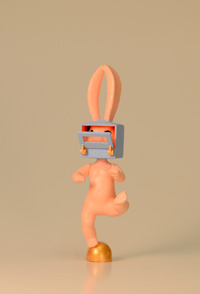körper eines kleinen plastikosterhasen, der kopf eines gummitierchen (könnte eine stilisierte maus oder ein schosshündchen darstellen), ein trichterförmiges plastikteil mit quadratischem querschnitt, ein kunststoffscheibe mit rundem loch |