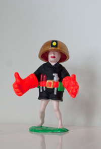 die beine einer kleinen indianerplastikspielfigur, helm und oberkörper einer spielzeugarbeiterfigur (bob der baumeister), der kopf einer plastikfussballspieler-spielzeugfigur, unterarme und hände eines gummispielzeugaffen |