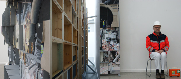 oben, mitte: die rückseite der absturzarbeit · rechts: während der eröffnung achtete ich als rettungssanitäter darauf, dass niemand dem archiv-absturz zu nahe kam · unten links: die fotomontage, die ich aus aus dem www gezogenen bildern kurz nach dem archiv-absturz fertigte · mitte: ein ausschnitt aus der arbeitsskizze · rechts: zwei der styropor-feuerwehrmänner während der bauphase