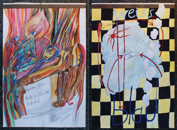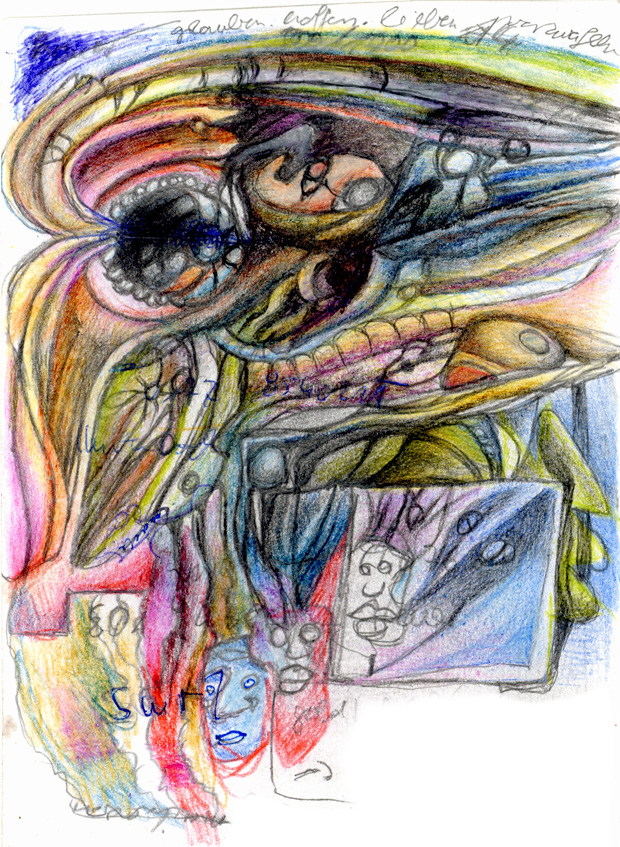 manchmal setzte ich mich an meinen küchentisch und übermale einzelne der krackeleien mit wasser- und deckfarben, schütte rotwein darauf oder kaffereste oder klebe papierstücke aus anderen krackeleien oder aus rumliegendem papierkram darauf. um die graue stunde zwischen 21:00 und 23:00 uhr nicht zu stunde des grauens werden zu lassen. die fotos von krackeleien hier gehören zu einer serie von 76 zu einem buch zusammengefassten. jedem bild stellte ich darin einen kurzen text zur seite.