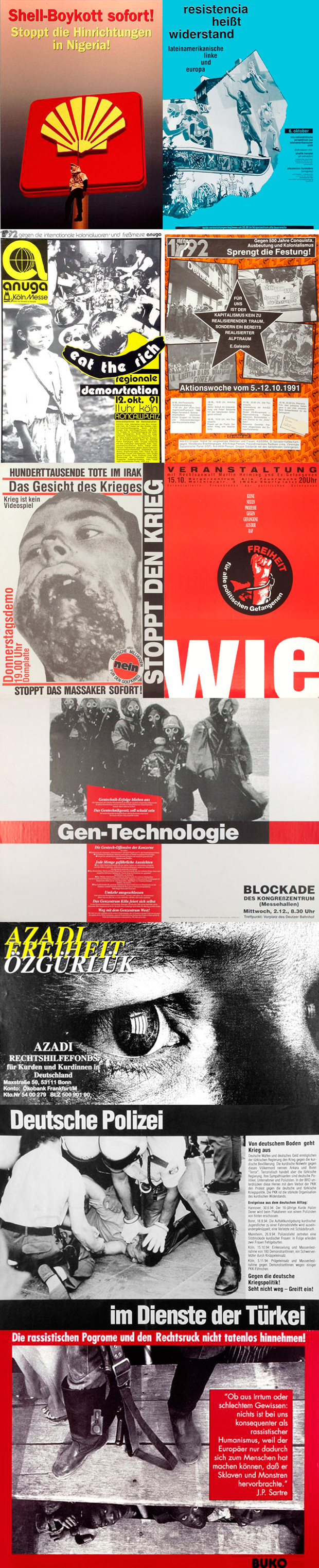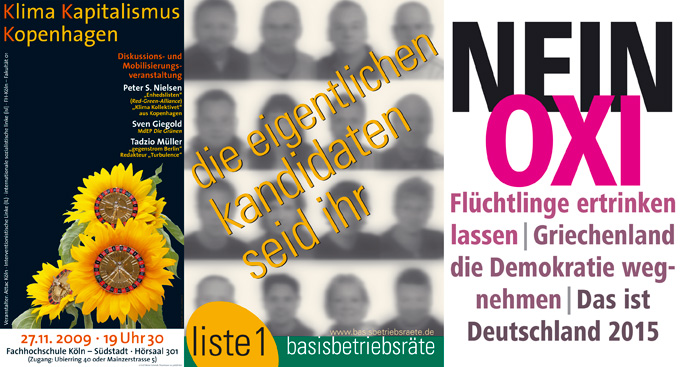 links: kölner mobilisierungsplakt zum klimagipfel 2009 · mitte: wahlplakat für eine liste zu betriebsratswahlen bei bayer (leverkusen) · rechts: stadtteilplakat zur krise in griechenland 2015 nicht nostalgischer nachschlag ich bekenne: ich war links, ich bin links und ich bleibe links! kapitalismus bleibt das problem und weder teil der lösung noch das ende der geschichte. gut, dass es geschichtsbwusste menschen gibt, die nicht ohne selbstironie, aber gerade darum ernsthaft, ästhetische und politische lebensäusserungen linker bewegungen archivieren und veröffentlichen. z. b. die gruppe hks 13. die schon zwei bücher mit linken bewegungsplakaten veröffentlicht hat: hoch die kampf dem – 20 Jahre autonomer Bewegungen – Plakatbuch Band 1 und vorwärts bis zum nieder mit – 30 Jahre Plakate unkontrollierter Bewegungen – Plakatbuch Band 2. im band 1 fand ich zwei dutzend plakate, die ich aus letra-set, fotosatz und papier-reprofotos zusammengeklebt habe. die roten fäden laufen nicht umsonst durch den "angewandt" genannten teil meiner webseite. zehn meiner 80er und 90er plakatgestaltungen stehen hier unten – leider sind einige davon heute noch so aktuell, dass mensch sie nachdrucken und an baunzäune kleben könnte: see the writing on the wall!