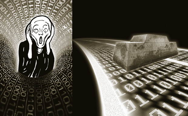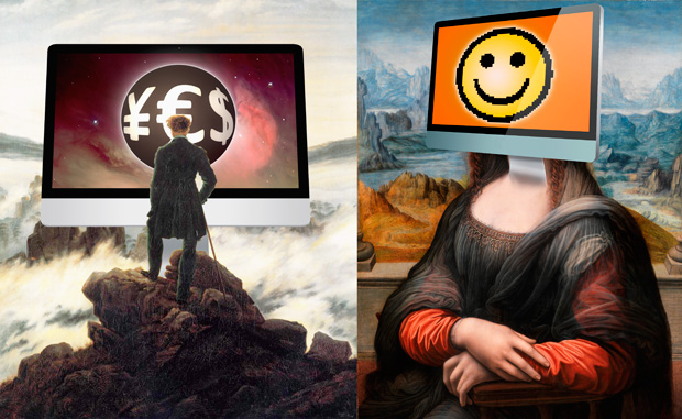 | digitalisierung · big data-monopole · zerstörung lunapark21, heft 35. illustriert mit einer serie digitaler fotomontagen, die jeweils ein werk aus der kunstgeschichte mit elementen der schönen neuen digitalwelt kurzschlossen. von oben links nach unten rechts: michelangelo buonarroti "die erschaffung adams" · albrecht dürer "betende hände" und "feldhase" · sandro botticelli "die geburt der venus" · leonardo da vinci "die proportionen des menschlichen körpers" · rené magritte "der pilger" · caspar david friedrich "der wanderer über dem nebelmeer" · leonardo da vinci "mona lisa" · edvard munch "der schrei" · wolf vostell "ruhender verkehr" · deutscher meister um 1600 "der tanz um das goldene kalb" | |||||||||||||||||||||||||||||